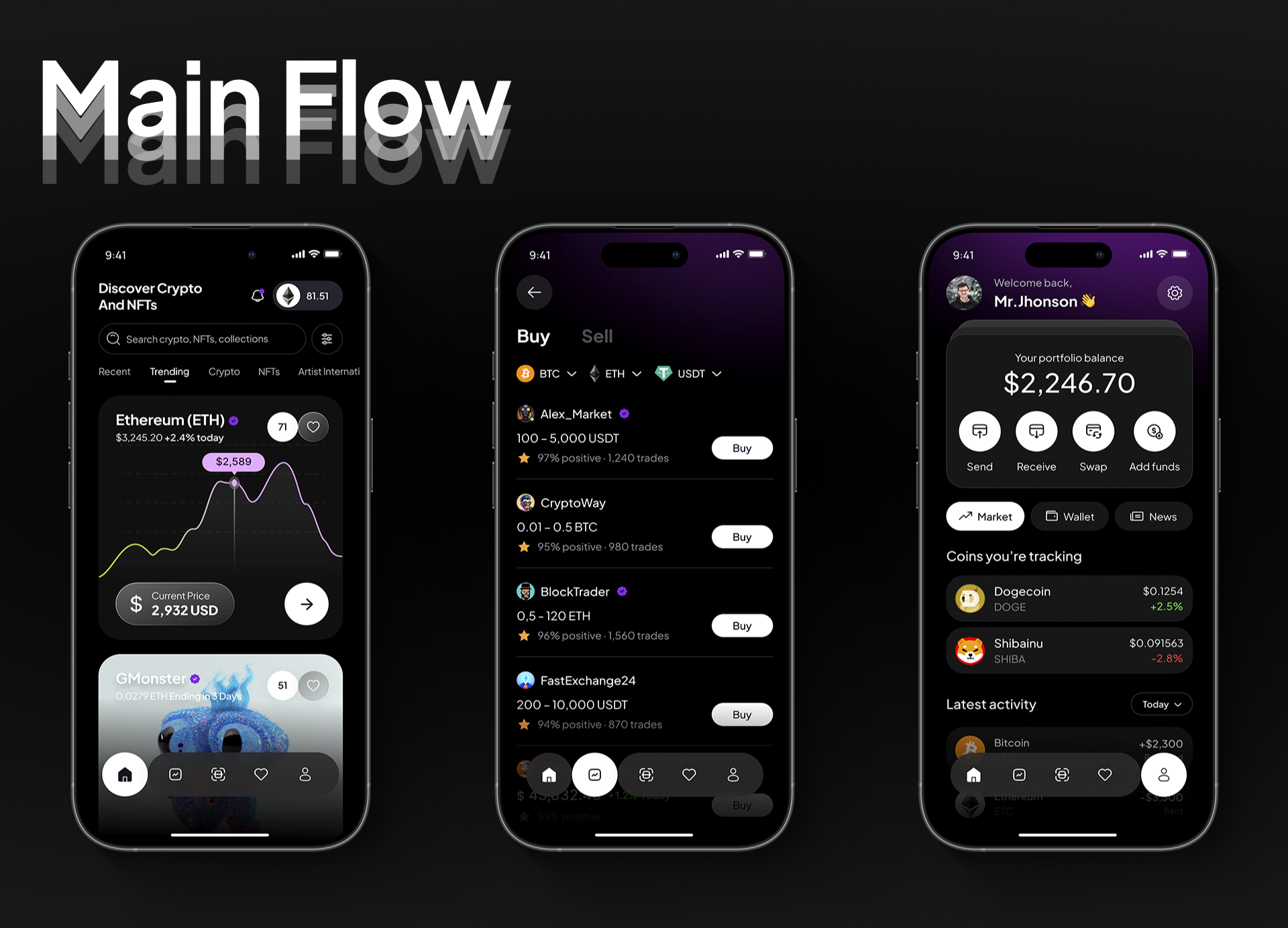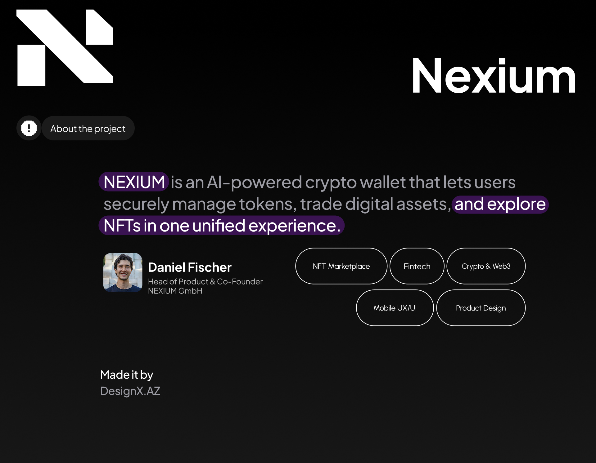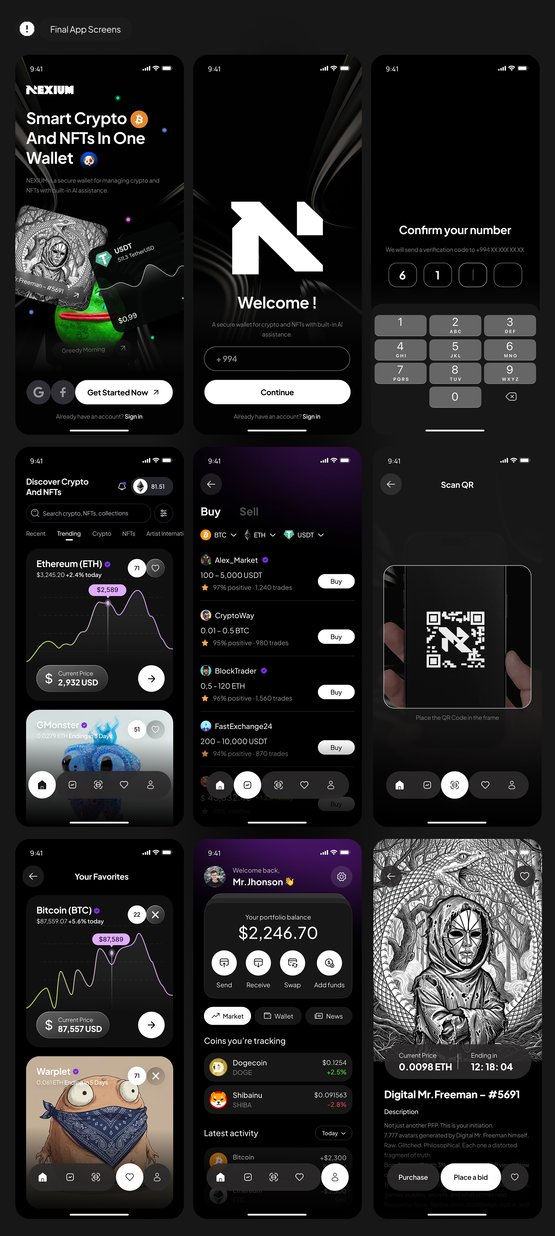 NEXIUM is a crypto and NFT mobile app designed for seamless asset management, trading, and P2P transactions. The project focused on creating a clean, intuitive interface with structured user flows and a strong visual identity to simplify complex financial interactions and enhance user experience.